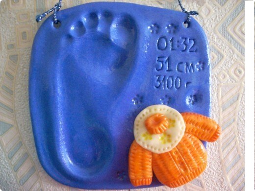 После того, как поделка остыла, можно приступить к оформлению. Раскрасьте оттиск в любой цвет, который вам нравиться. Имя и дату можно сделать другим цветом. Также можно приклеить по краям атласную ленту, бисер, блёстки. Воспользуйтесь своей фантазией для оформления.